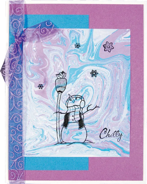 Decide where you wish to stamp the snowman on your marbleized cardstock and trim to a rectangle. Save the marbleized scraps for the inside. Stamp the snowman onto the marbleized cardstock with the black ink. Add snowflakes, and the word, “Chilly” as shown.