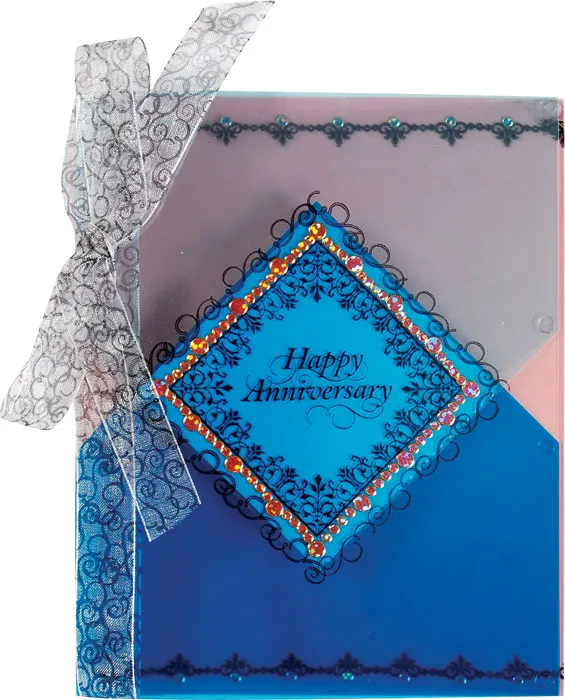 Stamp a fancy square onto the corner of a light blue transparency sheet. Turn the corner on point with the square at the bottom and stamp “Happy Anniversary” in the center of the square. Zot the corner of the transparency to the card (overlapping the dark blue piece) with the point centered 1 1/4” from the bottom. Trim off the excess transparency from the sides and top and adhere the loose corners of the colored transparency to the card with Zots™.