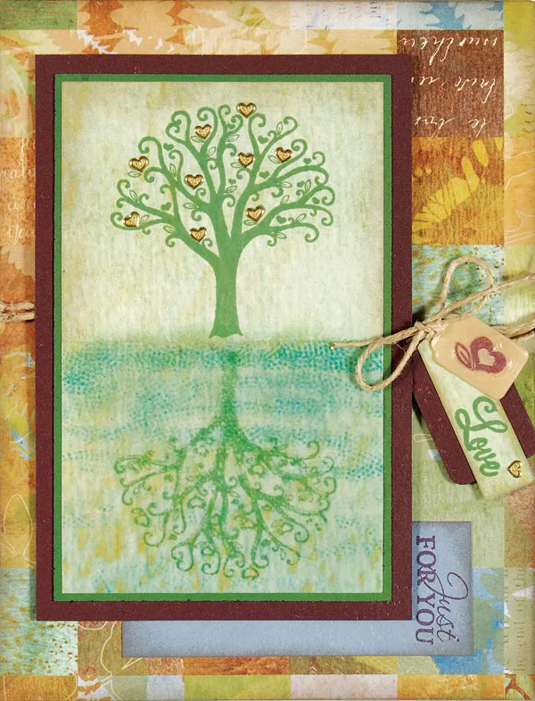 For the inside of the card: Cut green paper to 6 ½” x 1 ½” and glue to the left edge of the card. Cut square patterned paper to 3 ½” and cut across diagonal. Glue to top right and bottom left corners of the paper. Stamp tree and “Love” with Warm Green in lower right corner and ink around the edges with Pumice Stone.