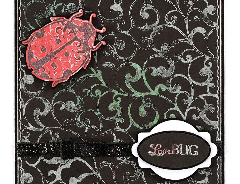 Apply white and red paint to the “Love Bug” greeting and stamp onto black cardstock. Use the oval and “Lola” label templates from the Design Tool Kit to trace and cut out the greeting and label. Mat each on suede and foam tape in place, as shown.