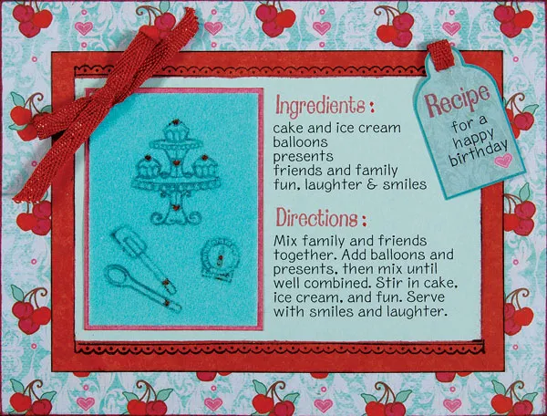 Inside the card: Ink edges of a 3 ¾” x 3 ½” cherries paper rectangle and glue centered on the inside, ¾” from the bottom. Write or computer print message on aqua paper or cardstock, trim to a rectangle, then stamp oven mitt and heart near the words with rhubarb stalk ink. Ink edges black and mat on red. Stamp scalloped border image across bottom of red mat. Glue centered over cherries paper. Stamp “with love” on the small red tag with black ink. Stamp a cherry near the bottom of the tag. Glue tag angled over bottom right corner. Zot ribbon as shown.