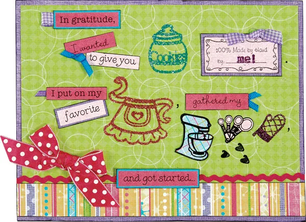 Computer print words as shown for the front and inside on bright pink or light pink paper, then trim to rectangles. Ink the edges or mat as shown, and add ribbons. Stamp mixer, measuring spoons, and other utensils on papers with black ink as shown, then cut around them. Stamp the “100% Made by Hand” and “Better than store bought!” label images on papers as shown and trim to rectangles. Ink edges and mat them.