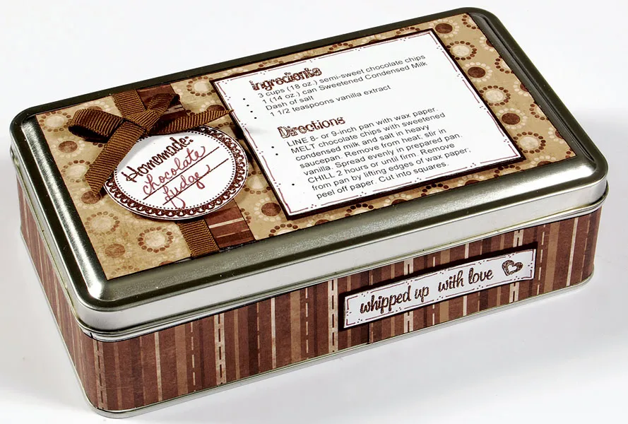 Print the recipe onto white cardstock and trim. Ink the edges and mat with brown cardstock. Add pen detail and stamp "Ingredients" and "Directions" on the recipe. Emboss with brown embossing powder. Foam tape to the lid.