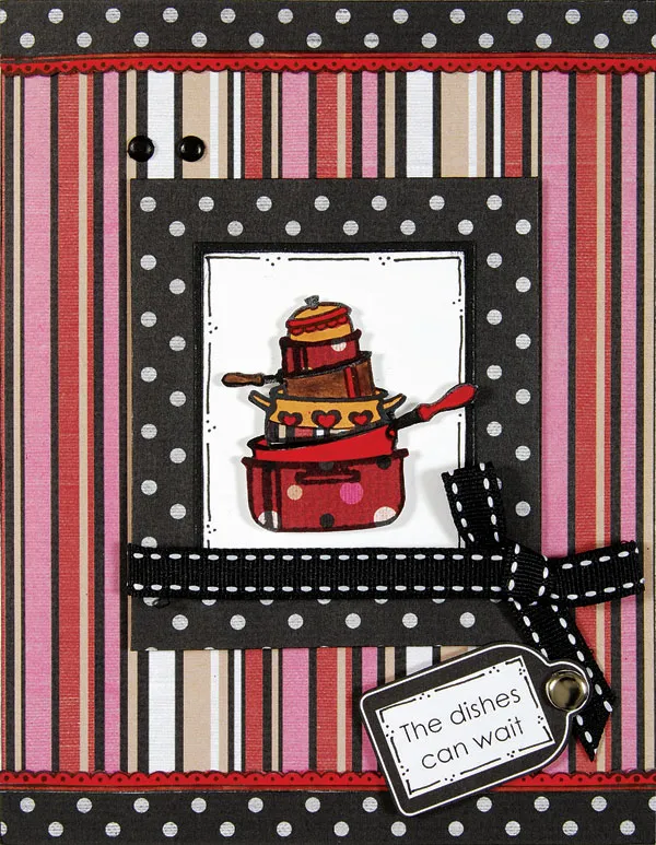 Stamp the dish image onto white cardstock and color the pans with brush markers. Stamp the image again onto red dot paper and striped paper and cut out the pieces and glue to the colored stamped image.