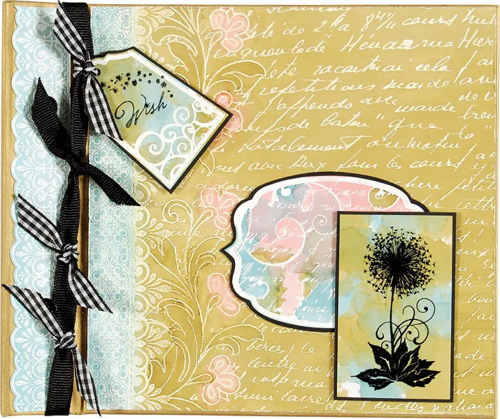 Stamp “Wish” and floating seeds on the tag. Cut out and mat tag with black cardstock. Stamp dandelion on glossy cardstock, let dry and cut to 3” x 1 ¾”. Mat with black cardstock. Foam tape to the album over the label, ¼” from the bottom and ¾” from the right edge.