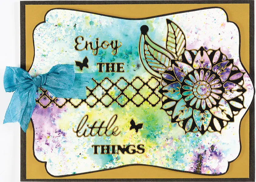 Place your card with the fold at the top. Cover the card with black cardstock. Cut a 6 1/8”x4 3/4" metallic gold specialty paper and glue it centered on the card.