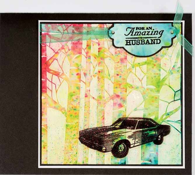 Mix a little red glitter embossing powder with black embossing powder and use to stamp and emboss the car on acetate. Cut out the car and Zot™ on, as shown.