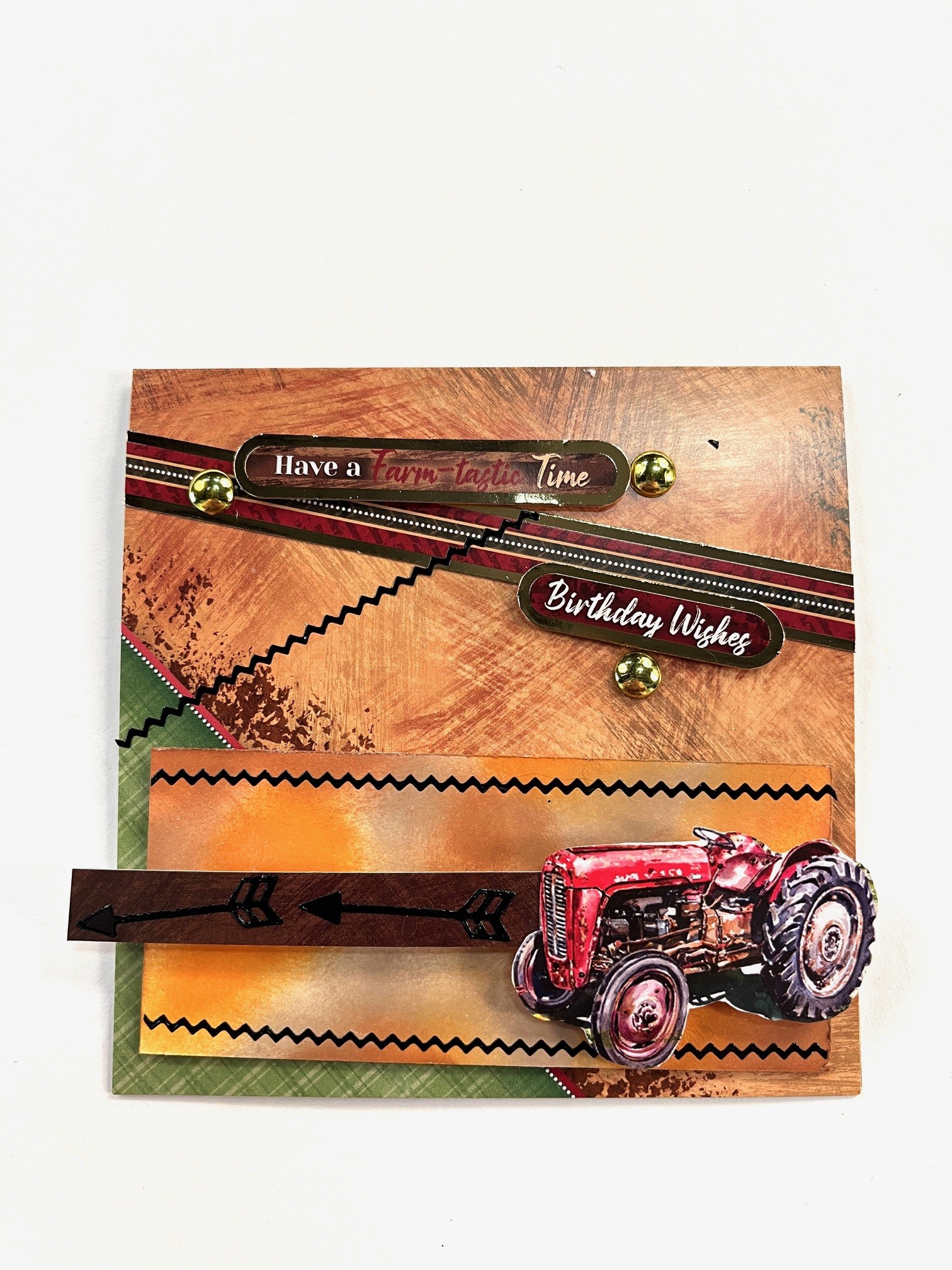 Select “A Farm-tastic Time” sheet then trim out the card. Fold on the score line and place so the fold is at the top. Glue the brown border piece at an angle as shown. Foam tape two sentiments on and around the border piece as shown. Place gold studs as shown. Place zig-zag Thin Line Dazzles™️ at an angle to border piece.