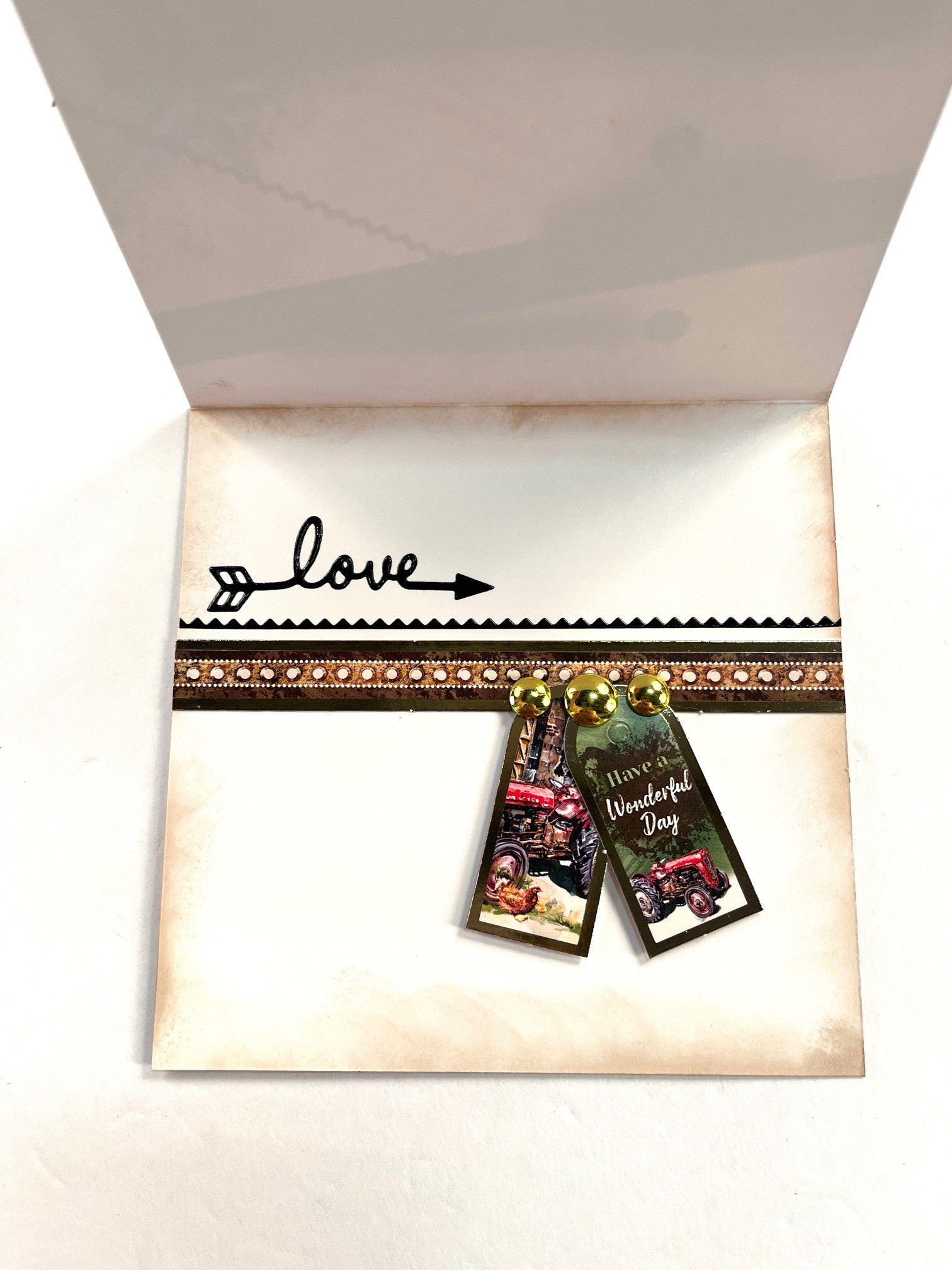 Card inside: Ink edges with blender brush using the Gingerbread Prism Ink Pad. Glue border piece 2 1/2” from bottom. Place Thin Line Dazzles™️ above it and place “Love” Dazzles™️ above that. Foam tape the tags along the border as shown. Place gold studs above tags.