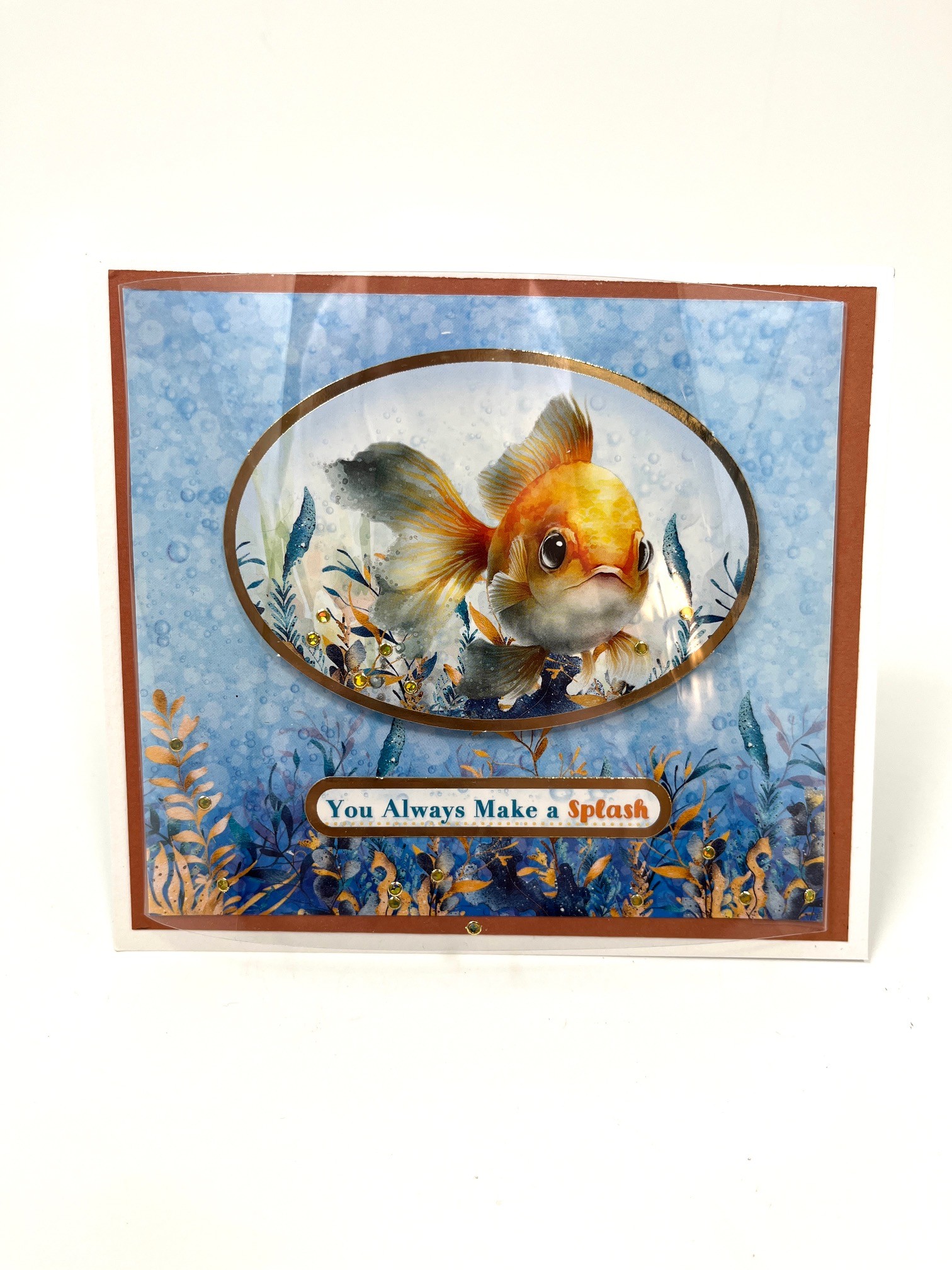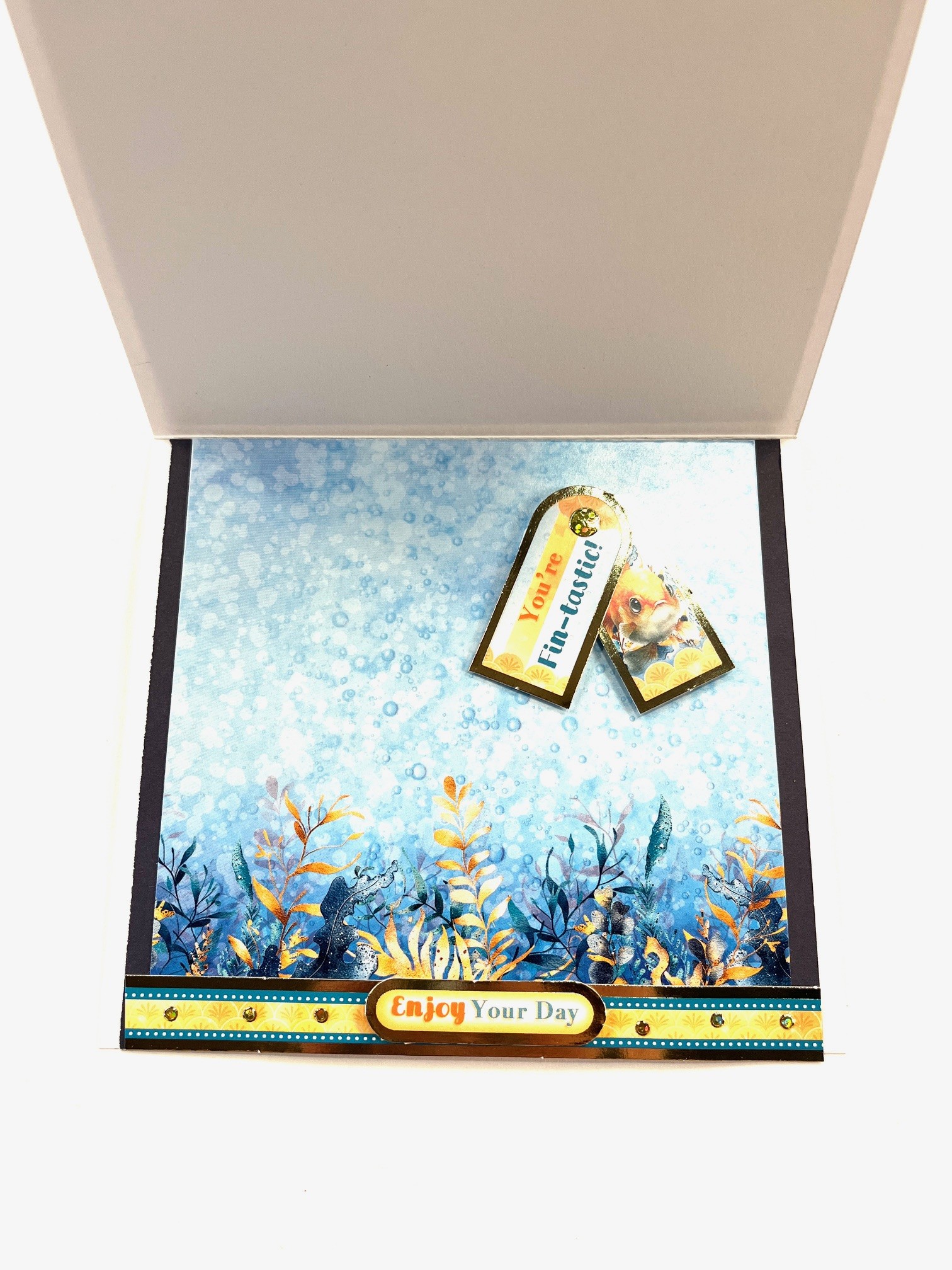 Cut down a card blank to 5 1/2”x5” and place with the fold at the top. Select the “Your Fin-Tastic” sheet. Cut the blue card into 5”x4 ½”. Foam tape focal in the center and tape sentiment below it. Place gold Dazzles™️ in the area below the fish.