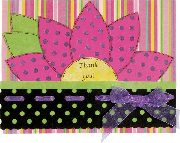 Print a greeting on the half circle and add to the center of the flower. Glue dot a bow to the green strip, as shown.