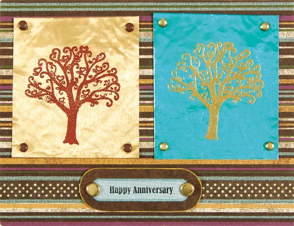 Place brown mini brads on each corner of the gold metal and gold mini brads on each corner of the teal. Glue gold piece on the card front, ¼” from the left and 1 ½” from the bottom. Glue the teal piece ¼” from the right and lined up with the gold. Write “Happy Anniversary” on a tag, ink the edges gold, add two gold brads, and foam tape it to the bottom center of the card front.