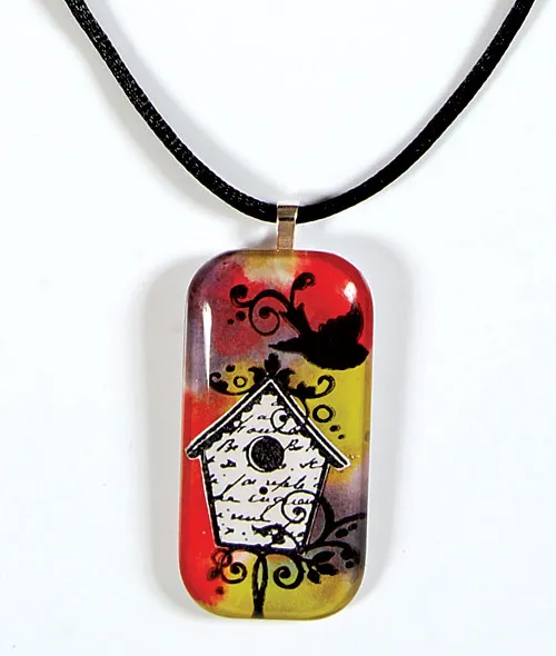 To make your necklace water resistant, make sure you cover all the edges of the paper with the lacquer. While the lacquer is still wet, place a heart bail on the lacquer at the top of the necklace with the rough side touching the lacquer. Let dry completely. String a black satin cord through the loop on the bail and you’re ready to wear your art!