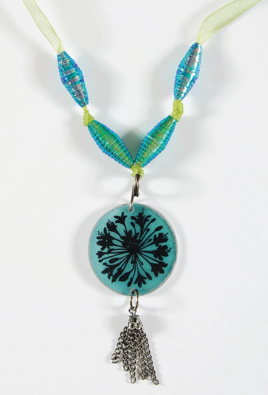 Take the 36” narrow sheer green ribbon from Nonna’s Garden ribbons. Wrap one end with Scotch tape to make a stiff “needle” to string your beads on. String on one blue bead a little past the center of the ribbon and tie a knot in the ribbon after the bead. String on one of the small circle charms. String on a green bead and the large circle charm (tie a knot around charm clip if desired, or let hang on its own). String on the second green bead, tie a knot in the ribbon, and string on the second small circle charm, then string on the last blue bead. Measure how long you want your necklace to be and tie the ends of the ribbon in a knot accordingly. Trim excess ribbon.