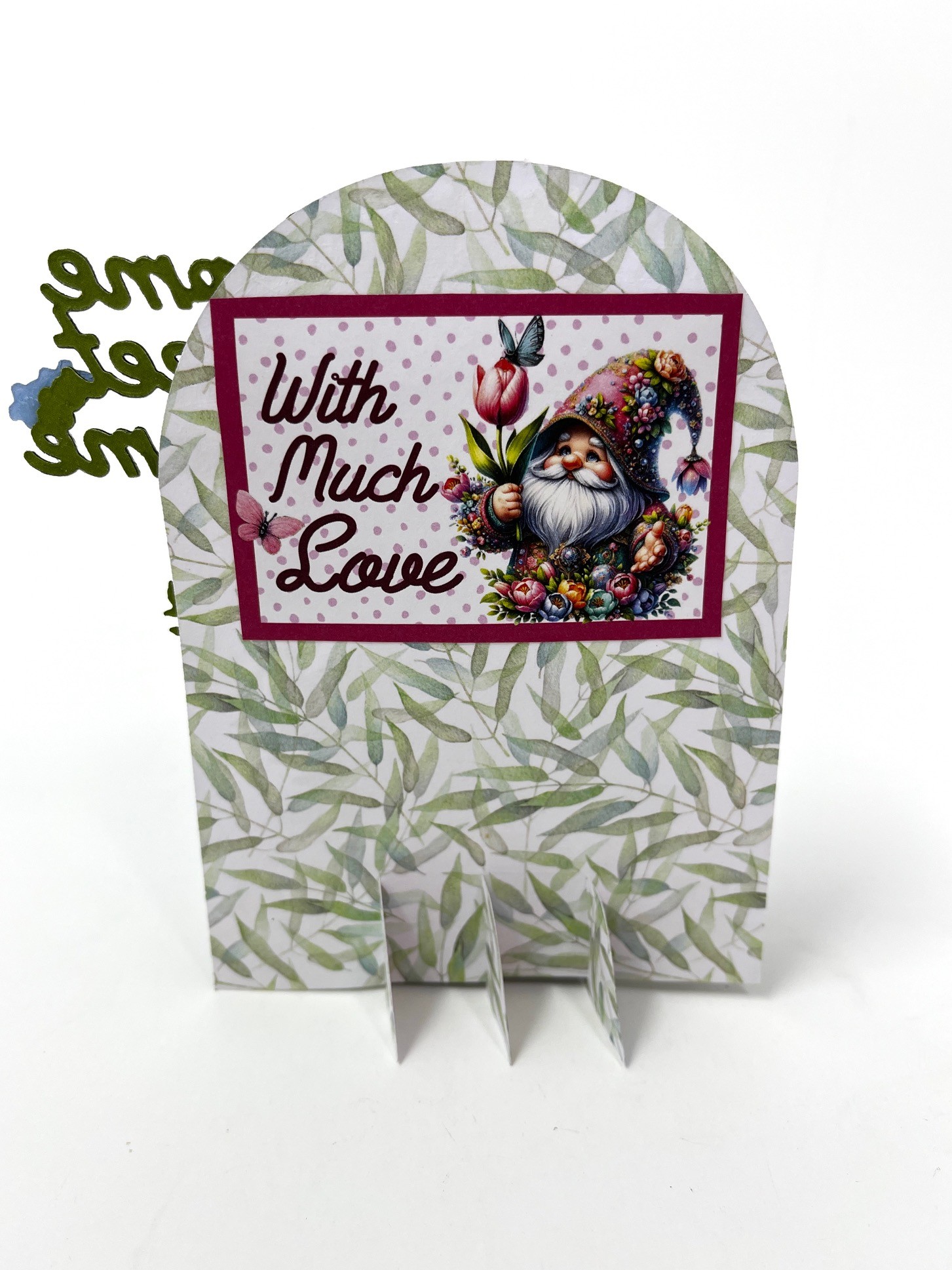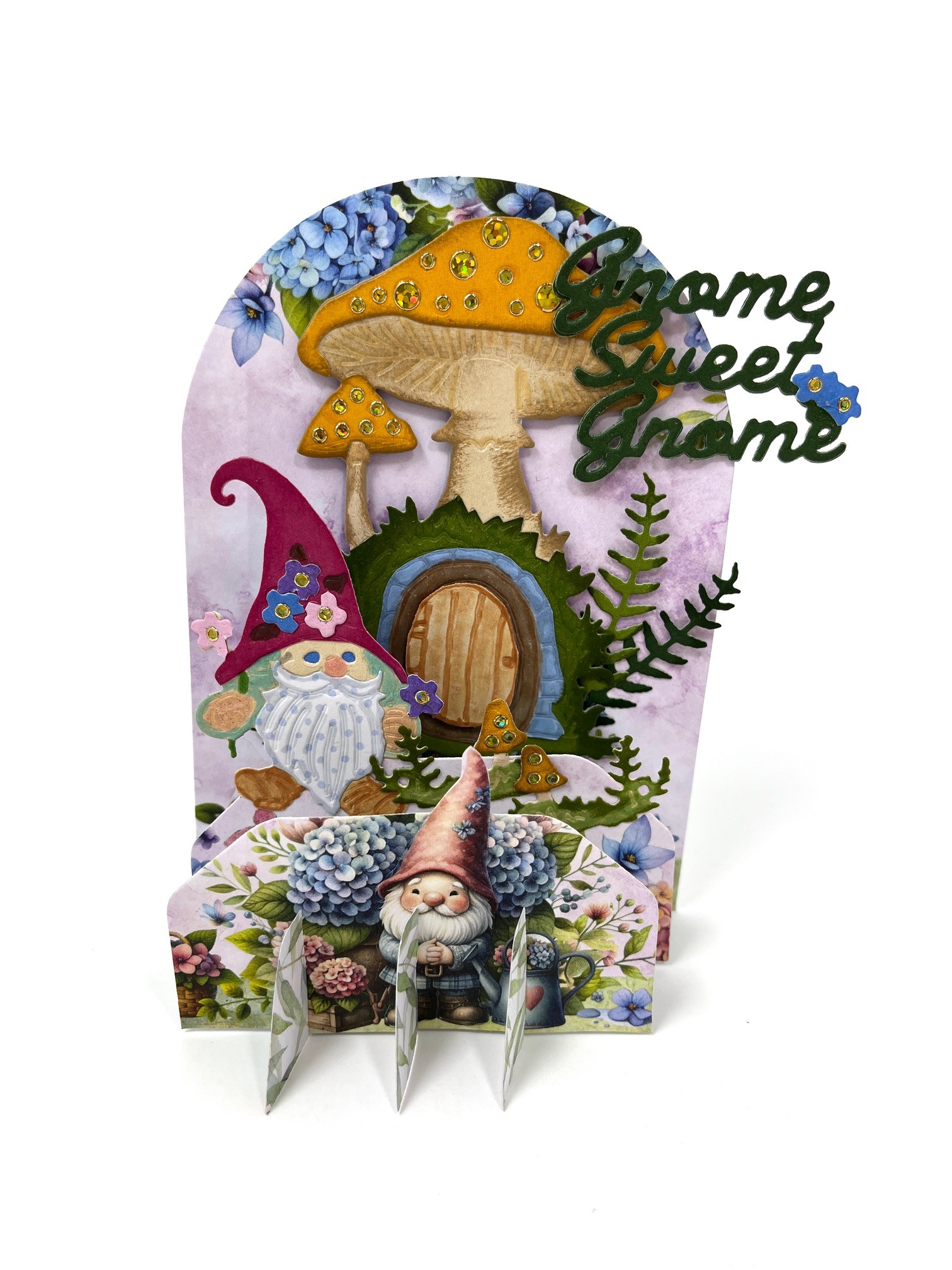 I cut the Basic Cross Hatch out of one of the Cut Outs in the 12” papers. When I cut the front cross hatch I cut it our of the bottom of a Cut out. Then I cut a separate gnome, and glued it to the front. That is why his hat stands above the bottom cross hatch piece