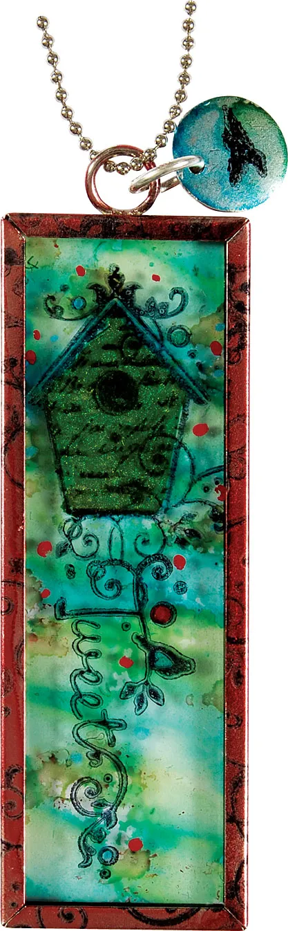 Use the watermelon alcohol ink to color the memory frame red. Let dry and stamp the surface with black swirls. Color the tiny metal tag with blue and citrus alcohol inks and let dry. Stamp with a single bird image. Attach the tag to the memory frame hanger with a jump ring. Place the Smooch ink side and Alcohol inks side of the slide together and place in frame and hang from chain.
