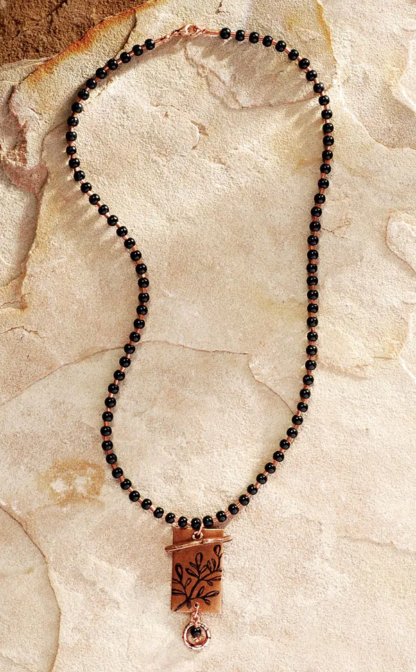 Stamp onto the copper pendant and toggle ring and let them dry. Use a jump ring to connect a twig toggle to the upper hole on the pendant. String a glass bead onto a head pin and make a wrapped loop.