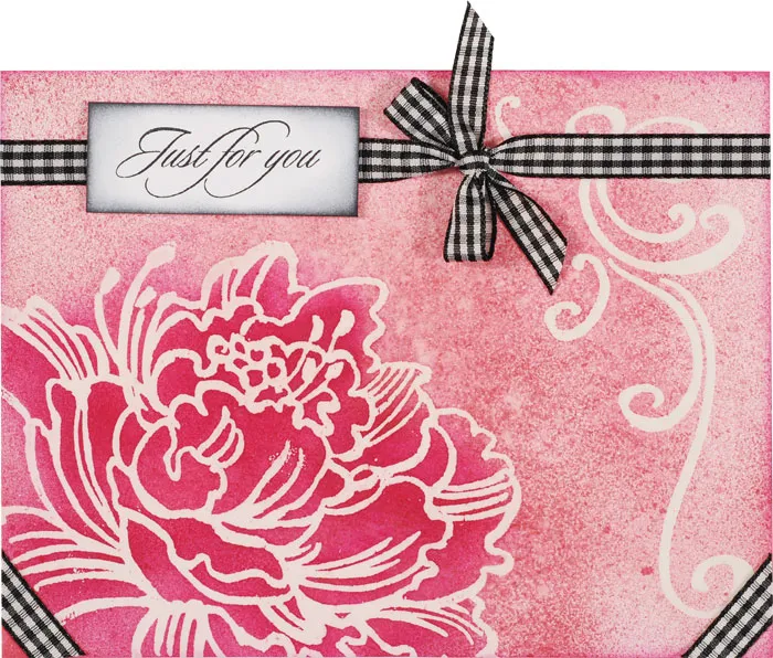 Stamp “Just for you” in black on a small piece of white cardstock. Use another leaf blender tip to ink the edges of the greeting, softly blending inward for a shaded effect. Foam tape to the card 1/4” from the top and 3/4” from the left.