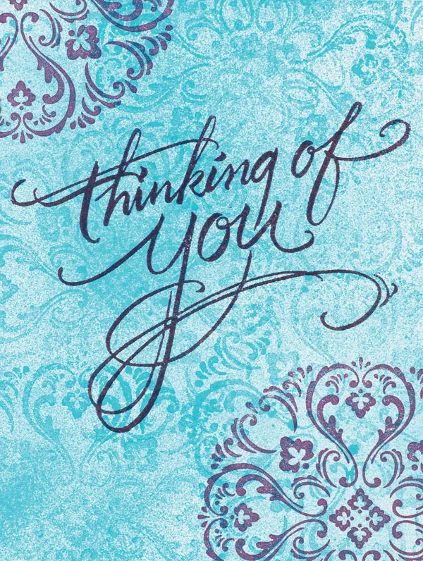 Stamp “Thinking of you” on the center of the card with VersaMark. Sprinkle on Amethyst Embossing Powder and shake off excess. Emboss with a heat embossing tool. Stamp the medallion stamp with Blackberry in the top left and bottom right corner as shown.