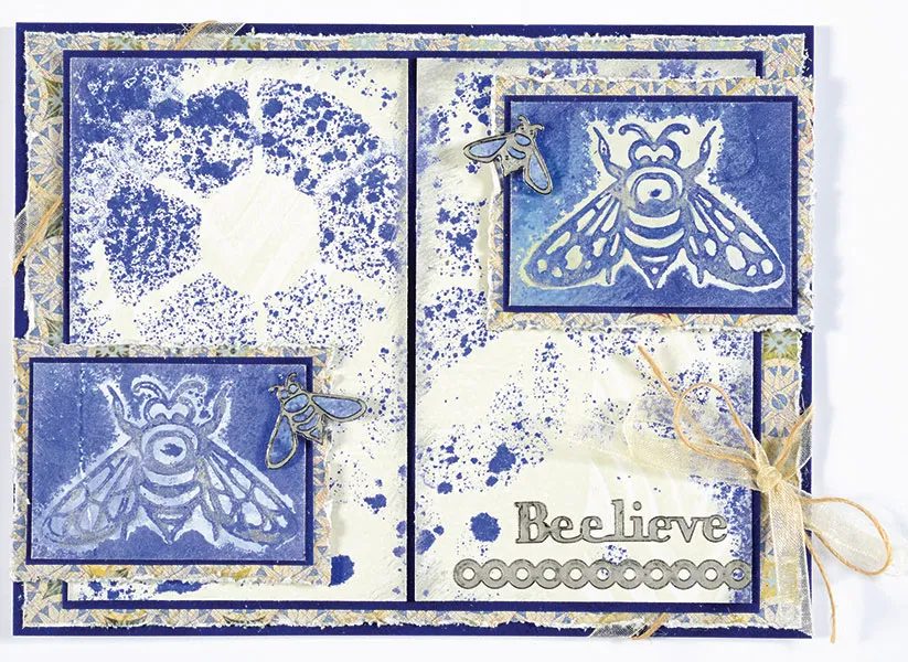 Place a large Dazzles™ bee onto the painted plate, pounce Brushed Pewter over the bee, and then lightly spray with Dylusions. Place 3”x3” white cardstock over the Dazzles&trade,; smooth the cardstock, and lift off. Let dry. Repeat the process to create another bee print. Save for Step 7. Remove the bee Dazzles™ from the plate and save for the card inside.