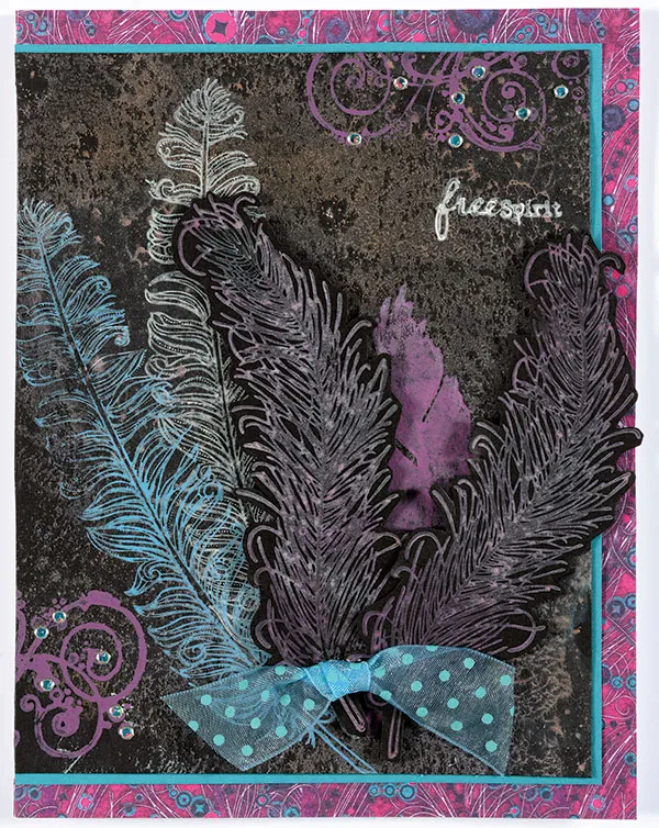 Clean off your palette and dry. Place dots of Picket Fence Distress Paint onto the palette and brayer it. Brayer the paint onto the large feather stamp and stamp the image on the left side of the black cardstock. Brayer the paint onto the “Free Spirit” stamp and stamp on the right as shown. Mix Salty Ocean onto the Palette with the remaining Picket Fence paint. Brayer and stamp another large feather to the left of the first. Stamp another blue/white feather onto a separate sheet of black cardstock and set aside. Clean the palette, and then brayer Seedless Preserves onto palette. Gently dip the small block feather directly into the brayered paint on the palette, and stamp ¾” to the right of the white feather. Dip swirl stamp into the paint, and stamp swirl images extending off the top right and bottom left corners. Let dry. Add some Picket Fence paint to the Seedless Preserves on the palette and brayer. Use the loaded brayer to apply the paint onto the medium feather stamp and stamp the image three times onto the separate black cardstock and let dry.