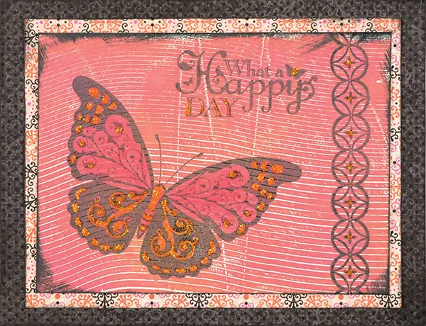 Stamp the large butterfly image on the card left and “What A Happy Day” at the top. Color the top of wings and body with Spectrum Noir PP5 pink pen and add orange glitter glue to wing details, border and greeting as shown. Let dry.