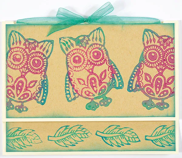 Inside: Use green and blue to stamp the feathers across the bottom of 6 ¼”x4 ¾” Kraft cardstock and an owl on the left, as shown. Let dry, then ink the edges and glue centered on your card.