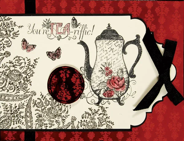 Mat the tag with black cardstock and glue flush with the left side of the card. Use the red pencil to color the roses, butterflies and “TEA” in the greeting. Glue a black bow to the top of the tag and foam tape the clock to the left of the pot.