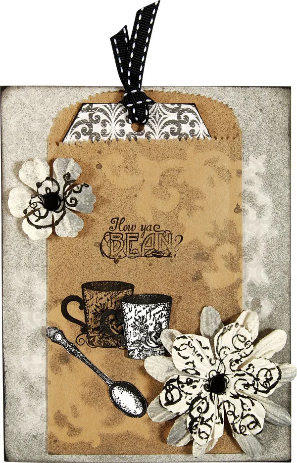 Stamp “How ya bean?” at the center of the bag and a coffee mug below and to the left. Stamp another mug and spoon onto white cardstock and cut out. Foam tape the second mug to the right of the first and glue the spoon below.
