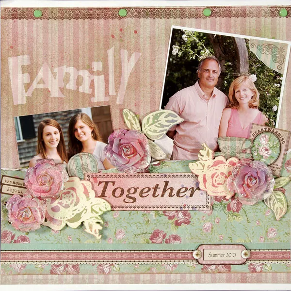 Tear the top edge of a 4 ½”x12" green rose paper. Use your finger tips to roll the torn edge over and apply brown ink. Glue the paper ¼” from the bottom edge of the pink stripe paper, leaving the top, torn edge free of glue and tuck photos behind the tear. Glue the border cut-out near the bottom edge of the green rose paper. Foam tape the dated tag cut out over the border.