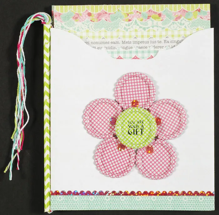 Page 3-Insert a 5”x 6 1/2” multi Penelope paper backed with pink cardstock into the envelope. Glue a 5 1/4”x1 1/2”pink rose Penelope paper to the center of a 5 1/4”x1 3/4” teal Penelope paper. Glue to the envelope 1/2” from the bottom edge. Zot™ a green bottle cap to the center of the pink rose Penelope paper. Place a large pink Jewel Dazzles in the center of the bottle cap.