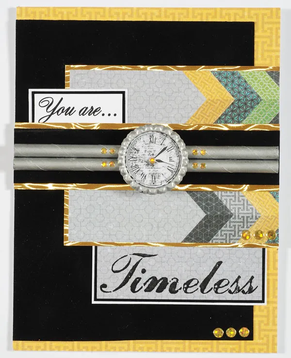 Card inside: Print the digital image of the clock background sized at 5” long on the bottom of a 5”x6 1/2” Geometrics chevron border paper (with chevrons on top). Glue on the card as shown. Place a 5” length of the border strip on the top and place Jewel Dazzles™ in each border hole.