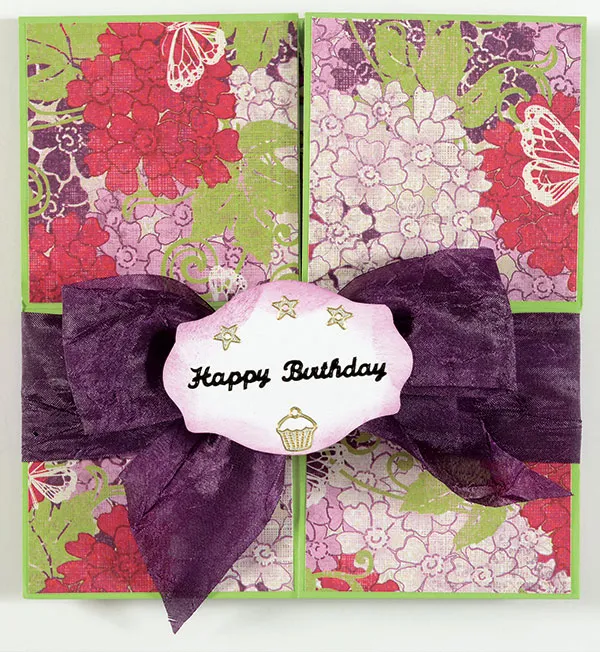 Tie a 14” length of wide purple crepe ribbon around the outside of the box. Tie a knot, and Zot™ to each section to hold in place. Tie a bow, and Zot™ onto the knot. Zot™ the last label with the “Happy Birthday” Dazzles™ to the bow center.