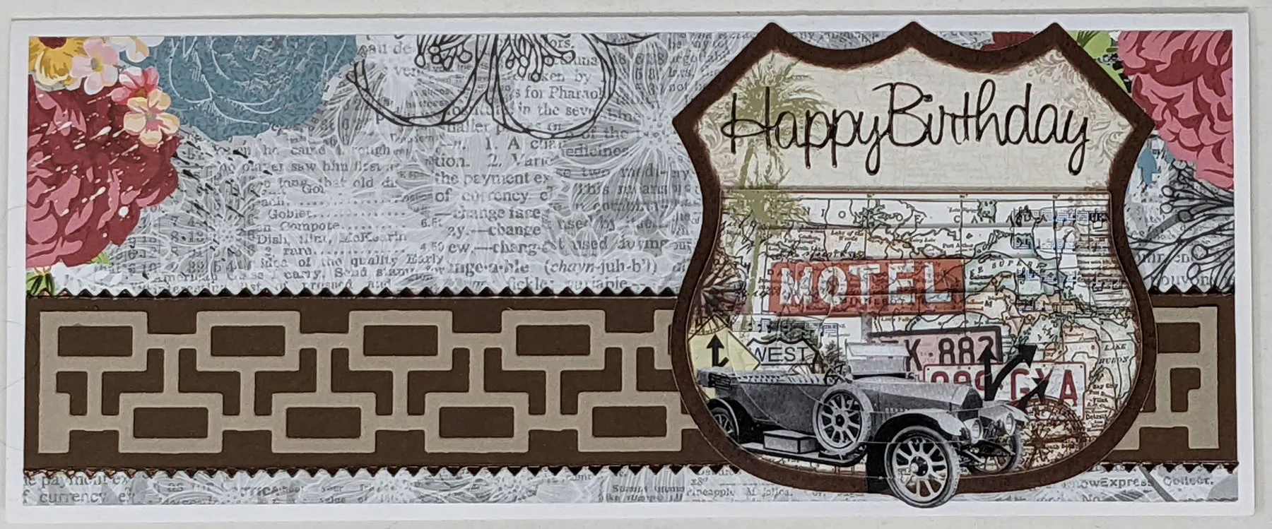 1. For the card front: Place the card with the fold at the top. Cut 8¼"x3¼" newsprint paper with flowers at the upper left and right corners. Glue it centered on the card front. Die cut the rectangles from tan cardstock. Cut two rows of rectangles off the die-cut, creating a border.