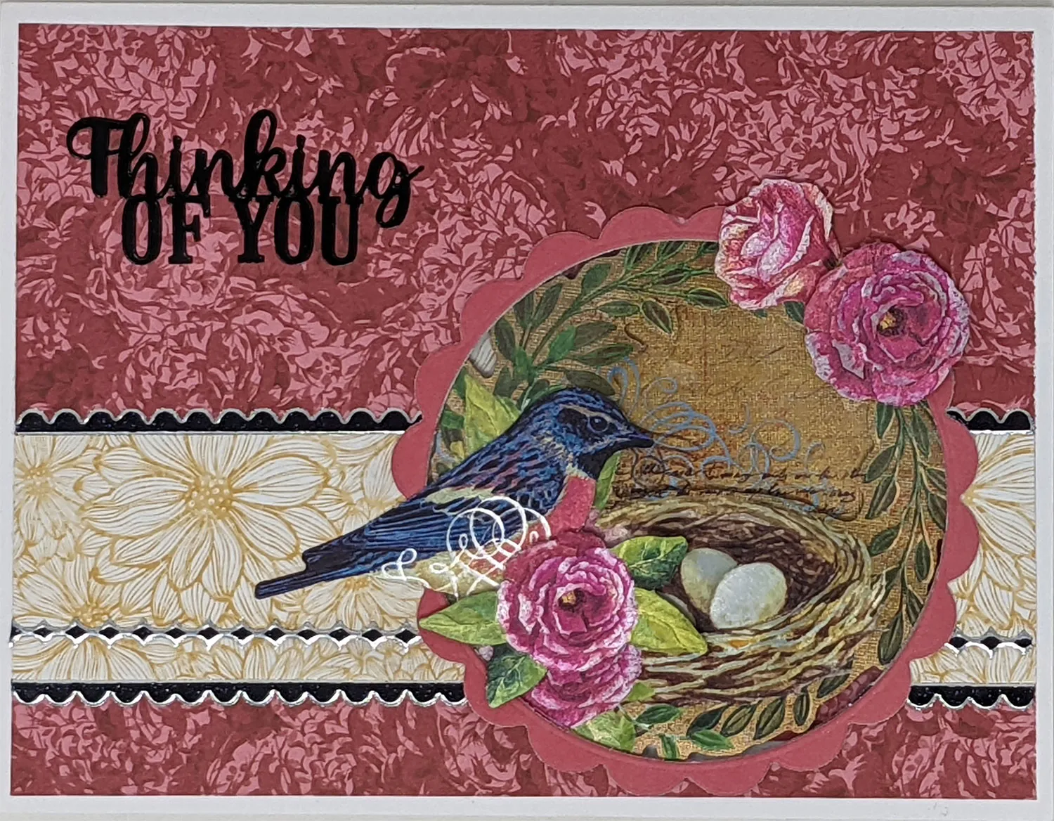 4. Foam tape piece #3 of the yellow-numbered papier tole design onto piece #2, then glue the bird to the window as shown. Foam tape piece #4 of the green-numbered tole design to piece #3, then glue the roses to the window at the upper right as shown. Place black “thinking of you” Dazzles™ on the card at the upper left.