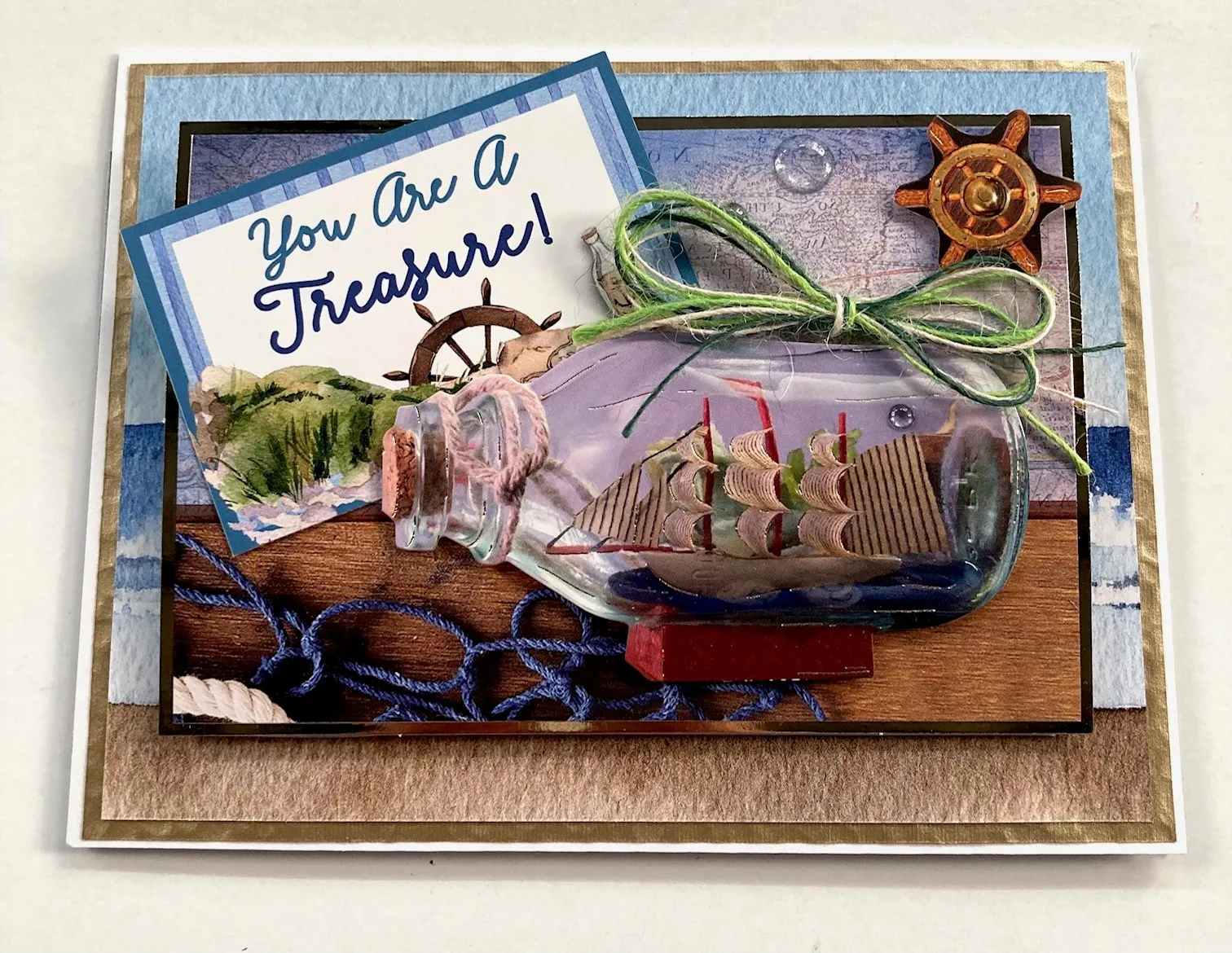 To build a small easel: cut 5"x6 1/2" blue solid cardstock, place horizontally and score at 1 1/2" and 3 1/4". Fold on both score lines. Glue the bottom of the Build-a-Topper background only to the bottom of the easel's front area. Glue the easel to the card leaving a 1/2" seascape pattern border. Cut out the "You Are a Treasure" from the patterned cardstock and glue to the Build-a-Card background in the top left corner. Foam tape the bottle and anchor as shown. Make and Zot™️ a 2 1/2" wide jute bow over the bottle. Place Dew Drops as shown.