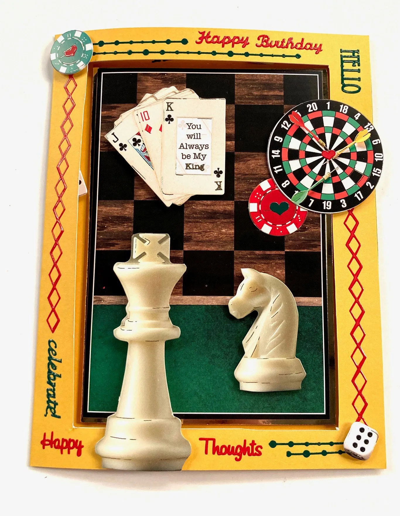 Foam tape the cards, small chess piece, then with tape runner secure the red game piece directly to board as shown. On the outside frame, foam tape the game piece in the corner, the chess piece at the bottom left, dice in the lower right, and the dart board on the right. Place Dazzles™️ stickers around the frame as shown.