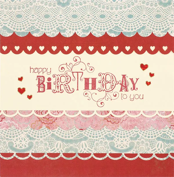 Punch along one edge of 5”x1” of pink pattern with the scallop punch. Glue to card 1 3/8” from the bottom. Punch one edge of 5”x2 1/2” of cream cardstock with the hollow scallop punch. Stamp “happy birthday to you” in the center and glue to card 1 3/4” from the bottom. Punch one edge of 5”x1 1/4” of red with the heart scallop punch and glue across card 3 1/2” from the bottom. Punch one edge of 5”x1 1/2” of blue lace with the scallop punch and glue across card 4” from the bottom. Trim off excess paper, flush with the card.
