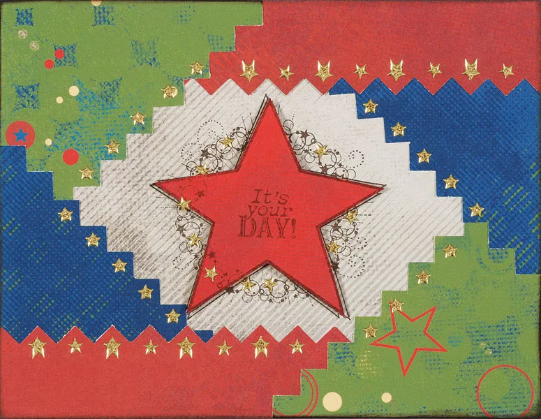 Stamp a star in the center of the card. Stamp again on green paper and cut out just the star. Stamp the greeting in the center and glue over the star on the card. Place gold stars around the greeting as shown.