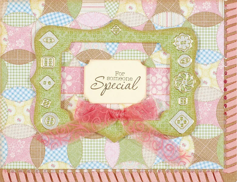 Cut a mini vintage sign from cream cardstock and stamp “For Someone Special” in the center with brown StazOn®. Ink the edges Toffee. Cut 3/4”x3 1/4” of pink floral, ink edges, and glue to center of card. Foam tape the cream greeting in the center. Foam tape the green frame around the greeting. Zot™ a pink sheer swirl bow to the center of the card below the greeting. Add silver buttons around the green frame.
