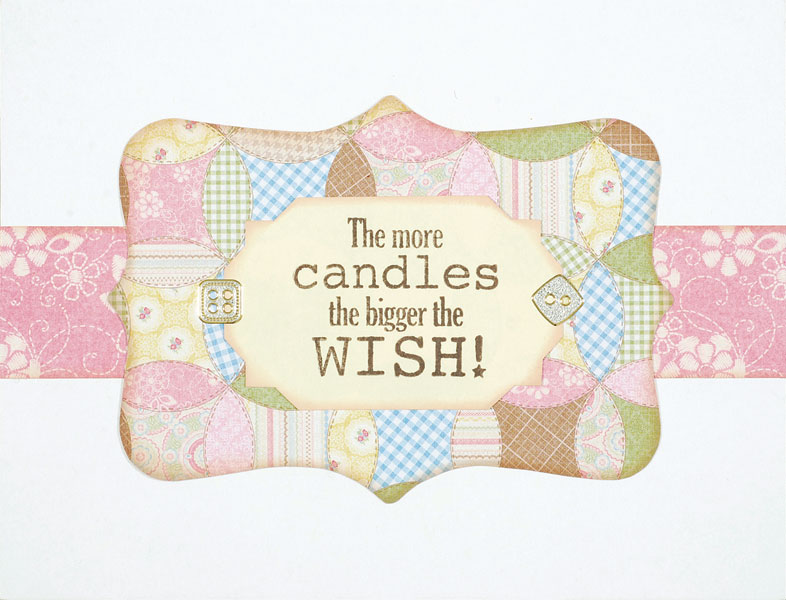 For the inside: Ink the edges of 1 1/4”x 6 1/2” of pink floral and glue across center. Ink the edges of a quilt paper bracket label and glue centered. Ink the edges of an art deco label made from cream cardstock and stamp a greeting in the center in brown. Glue to center and add a couple silver button Dazzles™ as shown.