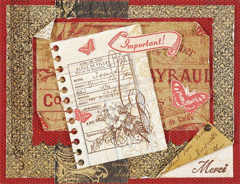 Wrinkle a 6 1/4”x4 3/4” black/tan swirl and flatten out. Distress and glue a 2”x5” brown script 1 1/2” from the left. Cut a 5”x3 1/2” red dot and use the scallop border along the bottom edge. Distress and glue1/2” from the top and 3/4” from the right, leaving the upper left corner unglued. Distress a 4 3/4”x3” newsprint and glue to the red dot 1/8” from the top and sides, leaving the upper right and lower left corners unglued. Roll down those corners and the upper left corner so the pattern underneath shows.