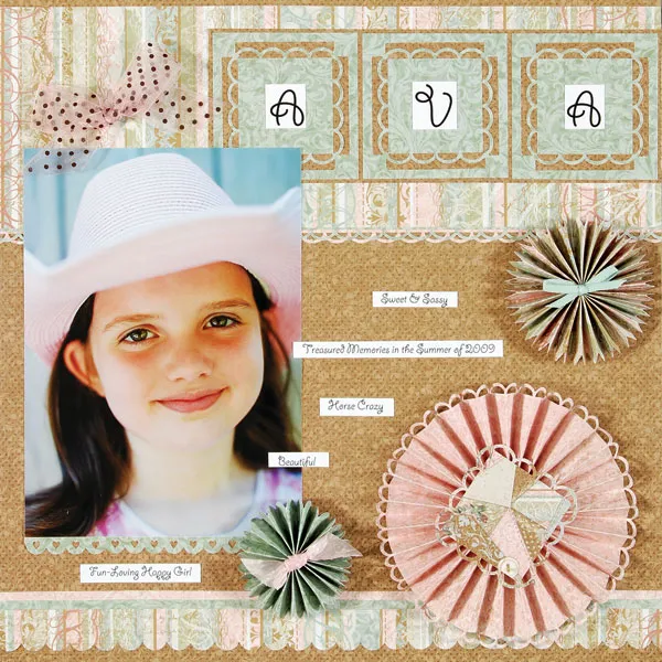 Embellish the circles with ribbons and paper as shown. Zot a pink/brown dot bow above the photo. Print your journaling on 1/4” strips of paper and glue randomly on the page.