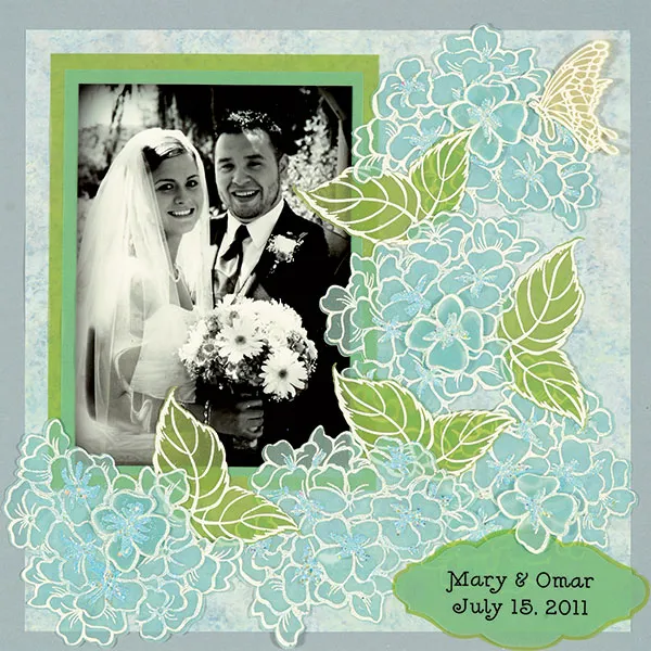 Stamp five large hydrangea stamps on vellum with VersaMark™ ink. Cover with white embossing powder, and tap the excess off. Heat emboss with the heat tool. Color with blue chalk. Stamp five small flowers using the same process. Color with blue chalk. Stamp four leaves on vellum and heat emboss with white embossing powder. Color with green chalk. Stamp one butterfly on vellum, and heat emboss with white embossing powder. Color with yellow chalk. Cut out all of the stamped images using the matching cutting dies, making sure to align your cutting die with the stamped image.