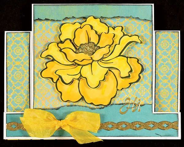 Outline the large and small portions of the flower with Yellow Spectrum Noir GB5, adding extra color around the outside edges of the petals. Outline the middle blossom with GB5 and color in the petals with CT3. Layer blossoms with foam tape and foam tape to the card as shown. Apply gold glitter glue to the flower center and let dry. Place “Hi” Gold Greetings Dazzles™ above the border and use ¾” wide yellow crepe Mirage Ribbon to make a bow and Zot to the left side of the border as shown.