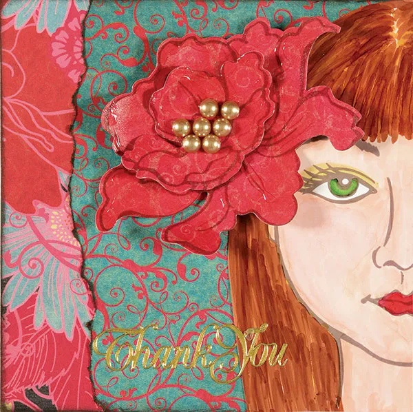 Cut out the head and around the hair. Glue the head to extend over the right edge of the card as shown and trim even with the card edge.