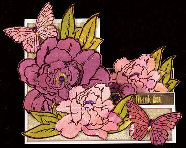 Once painted backgrounds are completely dry, stamp with VersaMark™ 8 leaves on the green background; 1 large blossom, 1 medium blossom, 2 small blossoms, and 1 butterfly from purple; 1 medium blossom from pink/bronze; and 1 medium blossom, 1 small blossom, and 1 butterfly from the pink combed background. Die cut the images.