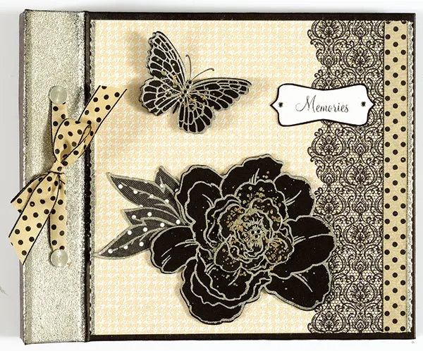Write or computer print “Memories” on white cardstock. Use the Tiny Tags & Little Labels template to trace a Rectangular Label B shape over the word. Remove the template and cut out the shape. Mat on black cardstock with 1/16” borders. Glue to the upper right portion of the album cover as shown. Add Silver Jewel Border Dazzles™ to the left and right edges of the tan houndstooth paper, and place Black Jewel Dazzles™ on the flower center, butterfly body and “Memories” tag as shown. Thread ivory/black dotted ribbon through the holes in the front side of the album and tie a bow between the holes. Add the pages and posts.