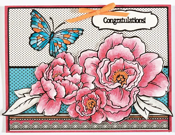 Arrange the flowers and leaves overlapping the paper on the card front and foam tape in place as shown. Use the Tiny Tags & Little Labels Template to trace a Bracket Label B shape onto white cardstock. Remove the template and cut out the shape. Paint the cardstock with the #251 pencil as you did for the leaves. Let dry and mat on black cardstock with 1/16” borders. Place Tiny Words & Phrases Dazzles™ “Congratulations!” centered on the shape. Glue on the upper right area on the card as shown. Use 1/8” wide orange grosgrain ribbon to tie a bow and Zot™ on the edge of the shape as shown.
