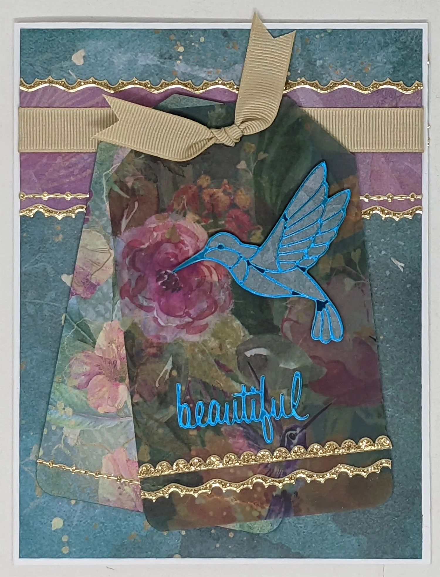 4. Place a teal hummingbird Dazzles™ on light teal textured paper and cut along the edges. Foam tape it to the tag so it looks as though it is feeding from a flower. Place teal “beautiful” Dazzles™ below the bird as shown.